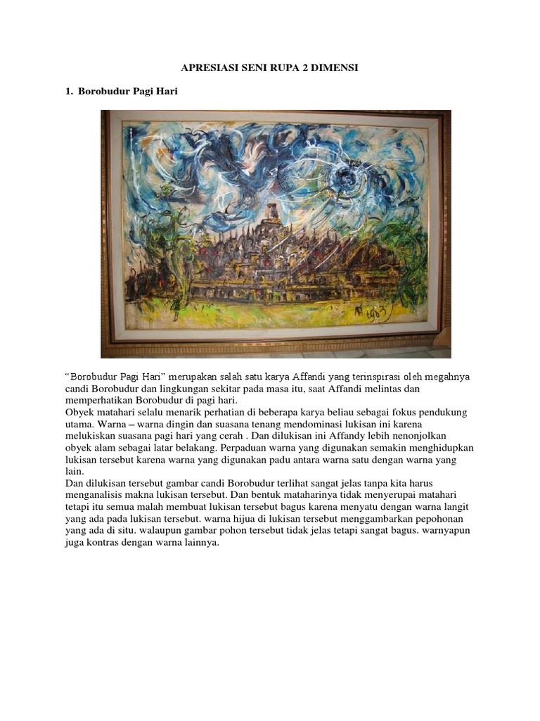 Berdasarkan media bahan dan tekniknya seni lukis dapat dibedakan menjadi lukisan cat minyak cat air pastel arang fresco al secco tempera azalejo kolase kaca dan batik. Borobudur Pagi Hari merupakan salah satu karya Affandi yang terinspirasi oleh megahnya candi Borobudur dan lingkungan sekitar pada masa itu saat. KRITIK LUKISAN PERAHU KRITIK LUKISAN PERAHU SENJA dengan pendekatan Holistik.