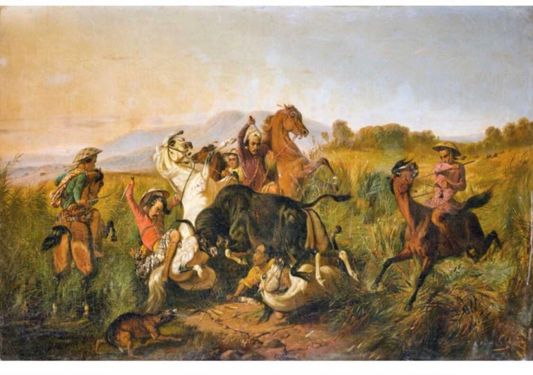 Galeri Nasional Jakarta Lukisan ini sebenarnya mirip parodi. Tokoh-tokoh yang menganut aliran romantisme antara lain Raden Saleh Theobore dan Gerriwult. Lukisan ini menggambarkan pemandangan pemburuan banteng di padang rumput dengan alang-alang.